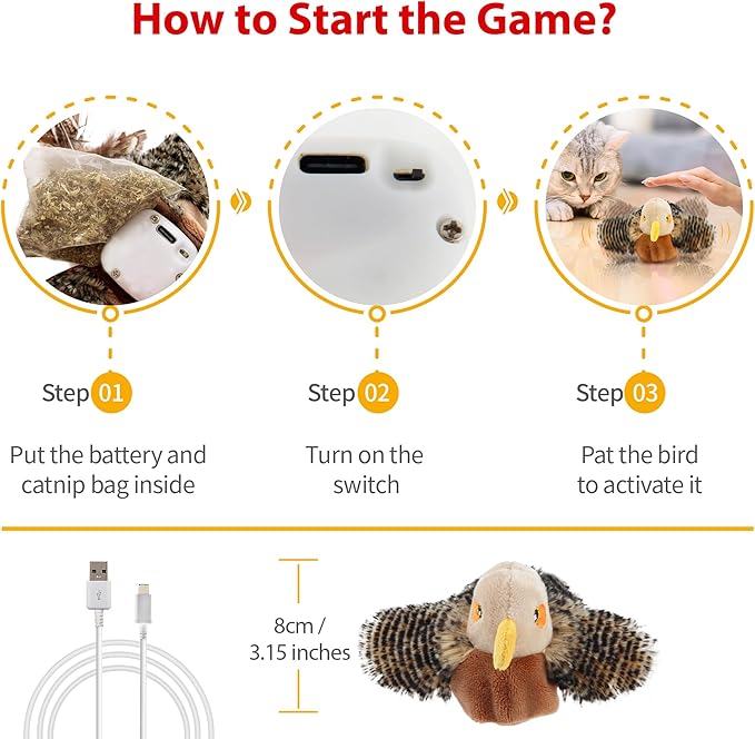 - UNIQUE SQUEAKY BIRD DESIGN: Like our traditional squeaky bird cat toys, the flapping wings cat toys with CATNIP inside built-in motion sensor. They are designed to satisfy your cat's hunting instinct and keep them from being bored. The cat puzzle toy will make realistic chirping bird sounds and vibrate their wings once they are patted (bite, chew, and chase could help to activate it)