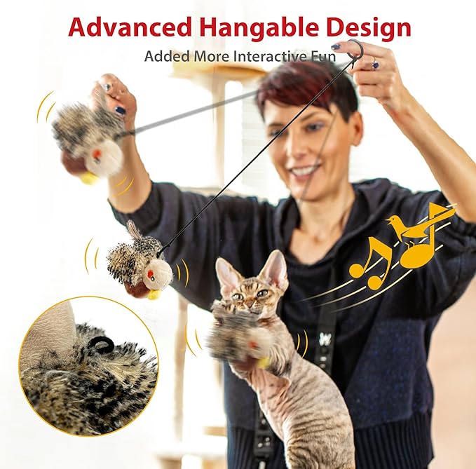 - SAFE & SOFT MATERIAL: The electronic cat toys are made of soft, safe, and relatively bite-resistant plush for your kitty to play with. It comes with a high-quality North- American catnip bag, realistic feather tail teaser, and elastic hanging rope with a ring to attract your cats more! The fishing pole cat toy are appropriate cat birthday toys or Festival toys for your pets