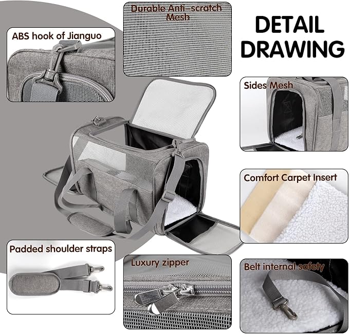 - EXCELLENT VENTILATION-Breathable 4sides mesh windows for great ventilation,the top load open and side mesh entry help to get your cats dogs easy getting into it.Portable Carrying handles and adjustable shoulder strap can also be used as seatbelt,back strap can fasten the carrier to your luggage firmly.