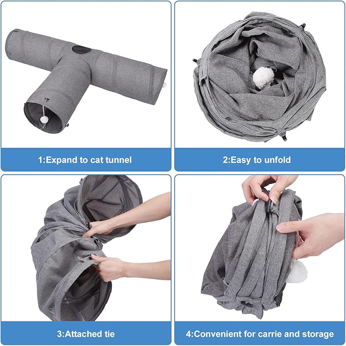 - More Ways to Have Fun: We provide drop balls and peep holes in cat tube for your cat to have extra recreational activities. The drop ball toy hanging in the middle of channel can drive the cat’s curiosity to explore.Additional feather wand can increase the interaction with your cat.