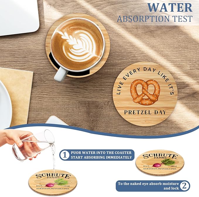 - 【PREMIUM The Office TV SHOW MERCHANDISE】This set of The Office merchandise includes 6 piece cork coasters for drinks and 1 coasters holder,The diameter of the drink coaster 3.93*3.93*0.2 inch (10*10*0.5cm),Which is suitable for kinds cups and scene,coasters for coffee table,coasters for wooden table.