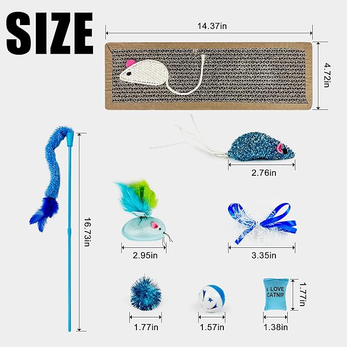 Cat Toys Kitten Toys Set, Cat Scratching pad with Catnip,Cat Wand Toy,Interactive Kitty Toys Cat Feather Toy Catnip Toy Fluffy Mouse Crinkle Balls for Cat Kitty Kitten (Blue)…
