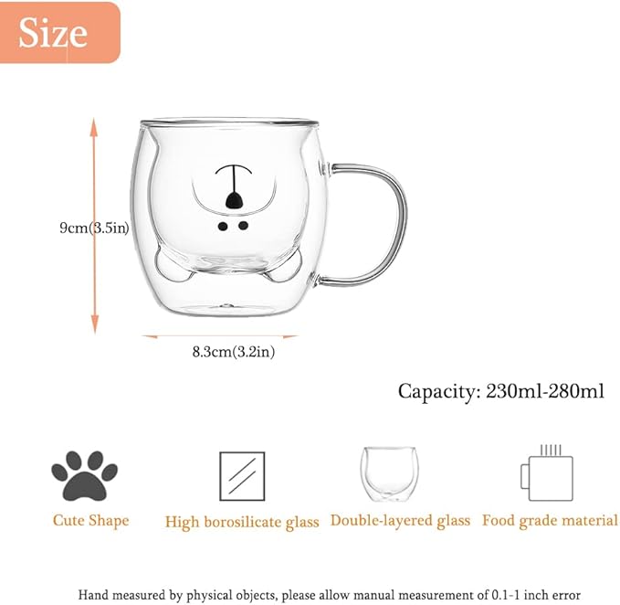 - Double-wall Insulated Glasses, each mug boasting a cute BEAR or CAT that holds 230-280ml.