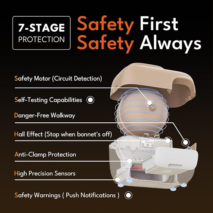 - EFFORTLESS SAFETY: Rest assured that your furry friend is always safe with 7 stages of SnowSafe⁺protection. When your cat enters the automatic cat litter box, the cleaning process will immediately pause. *Note that cats under 3.3 lbs (usually under 6 months) are prohibited to use this litter box.