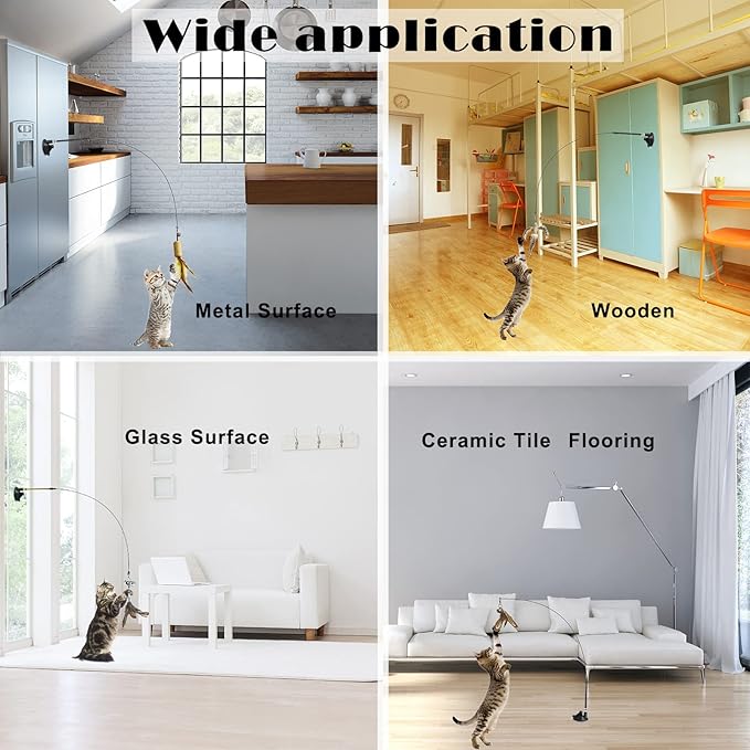 - Powerful Suction Cup - Removable sucker base, strong suction is not easy to fall off, can be held, adsorption, easy to tease the cat.The suction cup cat toy can be adsorbed on floors, walls, wood, glass, stainless steel, and marble.