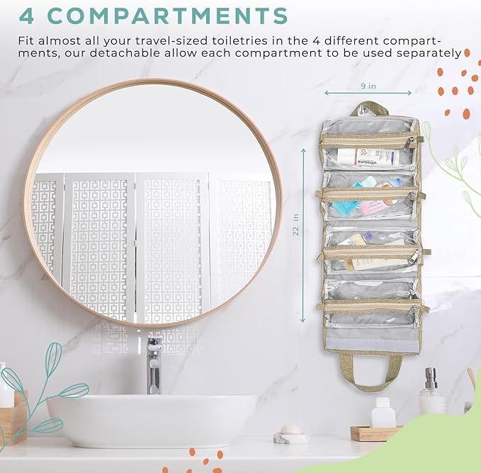 - Detachable Pouch Feature - Our hanging toiletry bag comes with 4 detachable PVC zip pouches that offers easy accessibility and is great for your roll up travel bag for toiletries needs. Each compartment can be used separately and take with you especially for on-the go. Truly a great travel organizer for women and men offering convenience and ease of access