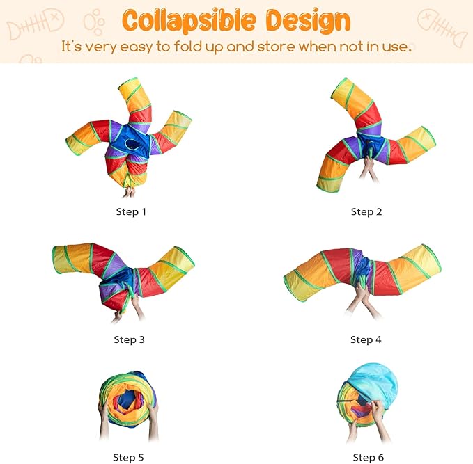 - Convenience to Use: This cat tunnel toy is foldable, it's easy to fold up and store when not in use. Collapsible design features space-saving, and our kitten tunnel comes with a storage bag, which is portable for you to bring this cat toy to any place