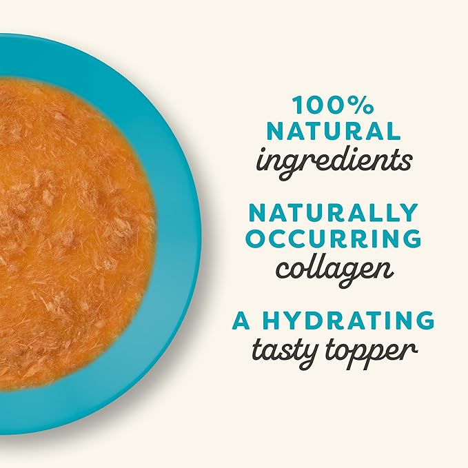 - Natural Source of Collagen: Packed with high-quality, real protein & enriched with natural bone broth, these cat food toppers are crafted to satisfy your cat’s instinctive cravings for rich, flavorful nourishment. The combination of premium protein & natural bone broth creates a delicious treat that’s not only irresistibly tasty but also a powerful source of natural collagen - a vital nutruent that aids in maintaining your cat’s joint, skin, & coat health.