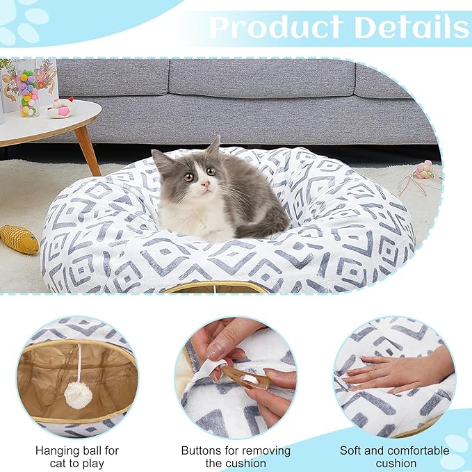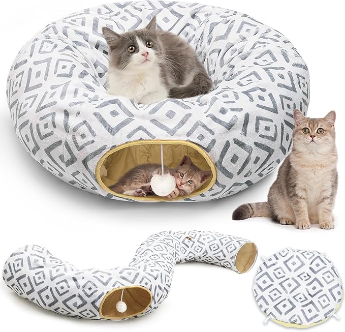 - Cats Tunnel: The cat donut tunnel can not only a cats tunnel to play, but also a cat bed to rest; There is a toy ball hanging on one side hole, so pets can not only play in the tunnel, but also play with the ball