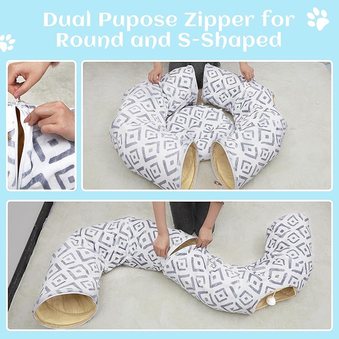 - Splicing Design: This cat tunnels are splicing design, it can be a round or s-shaped or semicircle shape according to cat's preferences; The circular tunnel has two holes, and the s-shaped tunnel have four holes, allowing them to enter and play at will