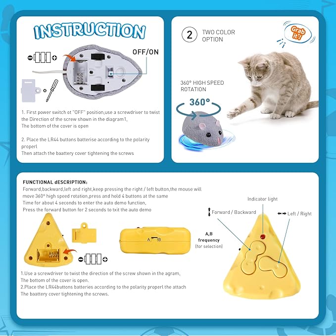 - Remote Control Mode:Turn on the switch,you can control the Mice forward,backward,left and right.and hold the left or reght button,it will rotate 360 degrees rappidly.Switch between remote control and sensing modes at will, allowing your cat to play heartily. It's a good interactive toy for cats, and cats must be very interested.