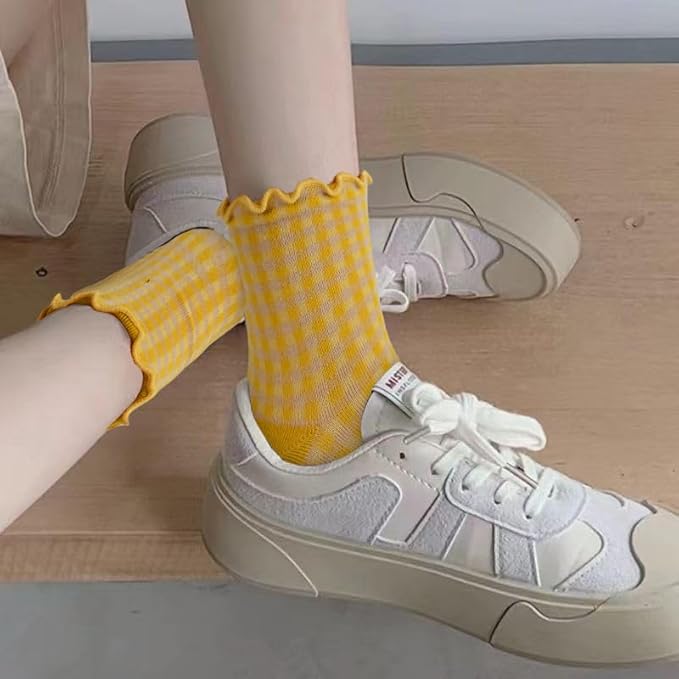 - 【Cute Frilly Design】The colored checkered socks choosed current fashion color, elegant ruffle trim, elastic socks mouth. The pastel socks for women adopt unique ruffled design, kawaii ruffle edge socks look vivid and lively. The unique color combination is full of vigor and vitality. The pretty loose top socks for women girls are not easy to slide down and will stay up well on your feet, make you look elegant, charming, beautiful and adorable.