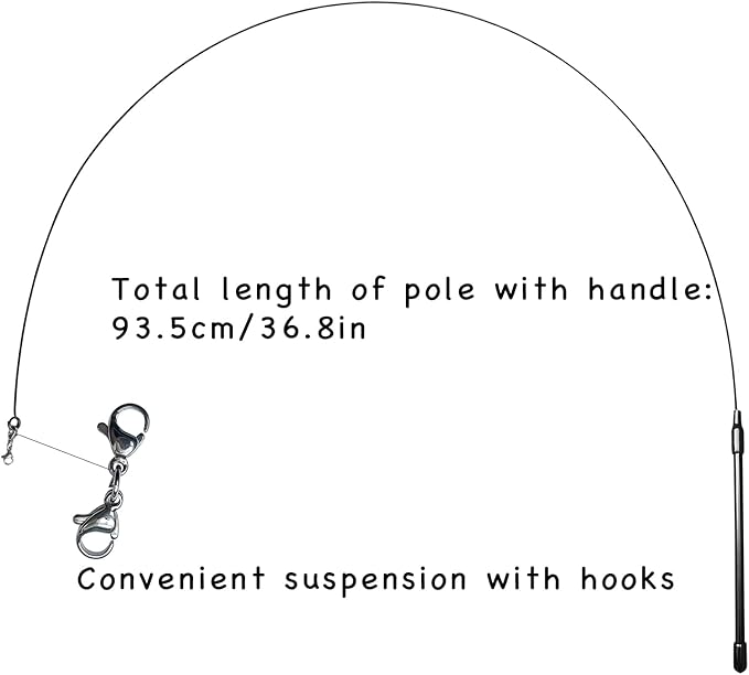 - The length of the cat teaser handle is about 6.5in/16.5cm, and the length of the steel wire is about 36.6in/93cm. The cat teaser has high toughness, durability, and easy control with long steel wires.