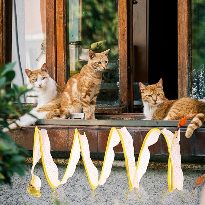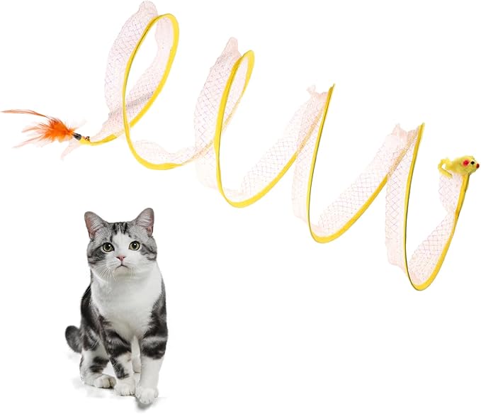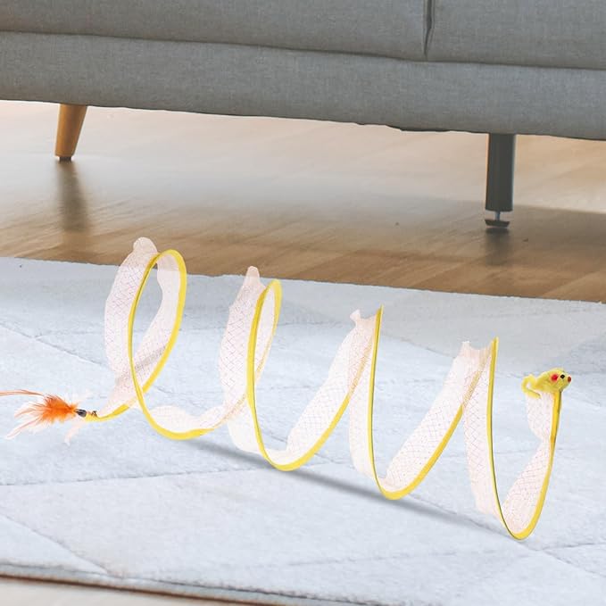 - Multifunctional Toy: There are fluffy mice and feline feathers hanging on both sides of the cat spring tunnel, which is a foldable cat tunnel and also a cat teasing stick. This is a great toy for cats to explore and helps stimulate your cat's curiosity.