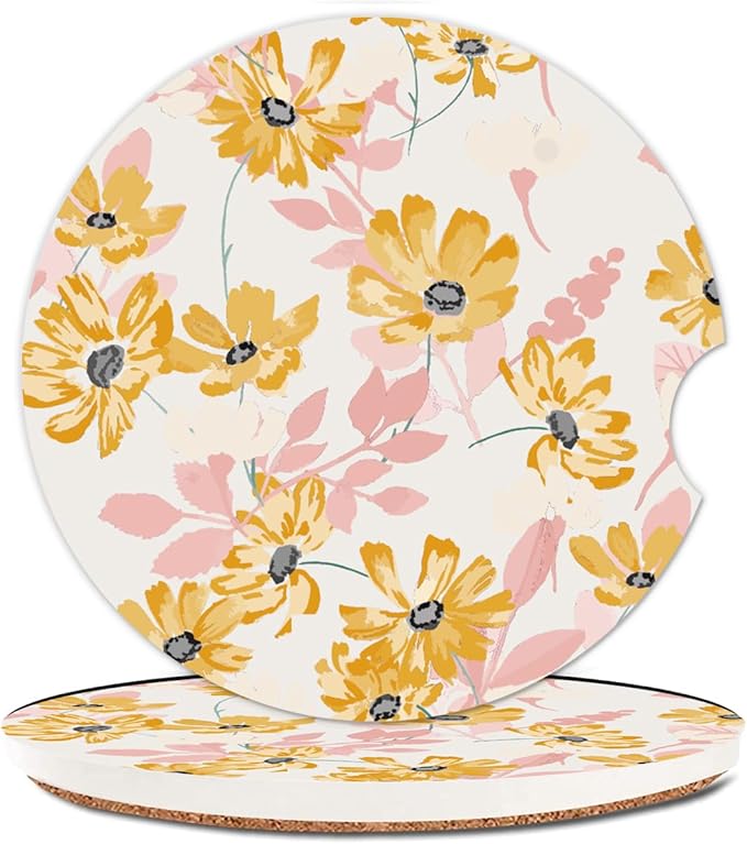 Absorbent Car Cupholder Coaster 2 Pack, Cute Car Coasters with a Finger Notch for Women & Men,2.56" Ceramic Stone & Non-Scratch Cork Base Drink Coasters, Cute Auto Accessories Gifts