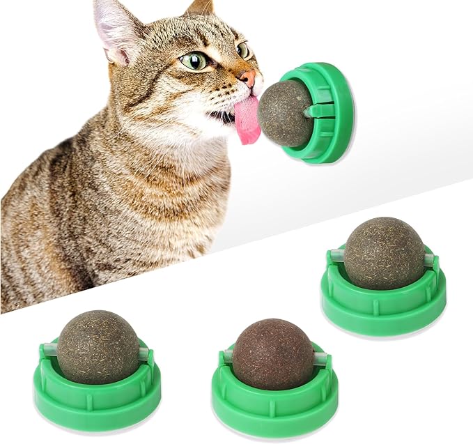 - Unique Design:These catnip toy can easily stick to the wall or other surfaces with strong viscous force, no falling off. And the cat mint ball rotates 360 degrees when your cat licks or plays.