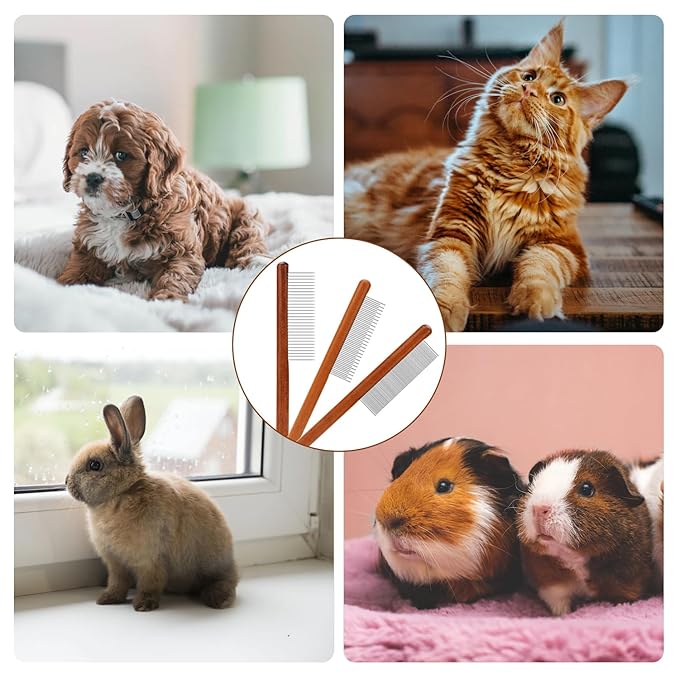 3pcs Grooming Comb for Pets, Solid Wooden Cat Combs with Wide & Narrow Rounded-Tip Teeth Pet Hair Comb Metal Flea Lice Tick Comb for Cats Dogs Rabbits Tangled Hair (3 Sizes)
