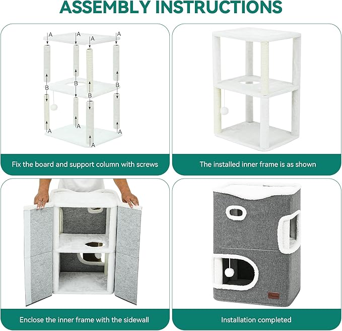 - 【Easy to Assemble】: This modern 2-level cat condo acts as a beautiful piece of pet furniture with an aesthetic look that will match the various stylistic designs of your home; Simply follow the instructions for a quick assembly because all the tools and components you need are inside the package; The exterior is removable for easy cleaning