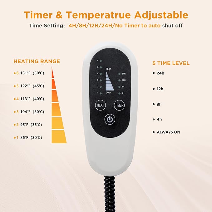 - 【Adjustable Temperature & Automatic Timer】Our heating pad features a 6-level temperature controller. It allows you to adjust the temperature range from 86°F to 131°F/30°C to 55°C. The cat heating pad with a timer function offers an automatic shut-off range of 4 to 24 hours, saving energy and preventing burns due to overheating. The timer LED will move down one level, indicating how much time is left.