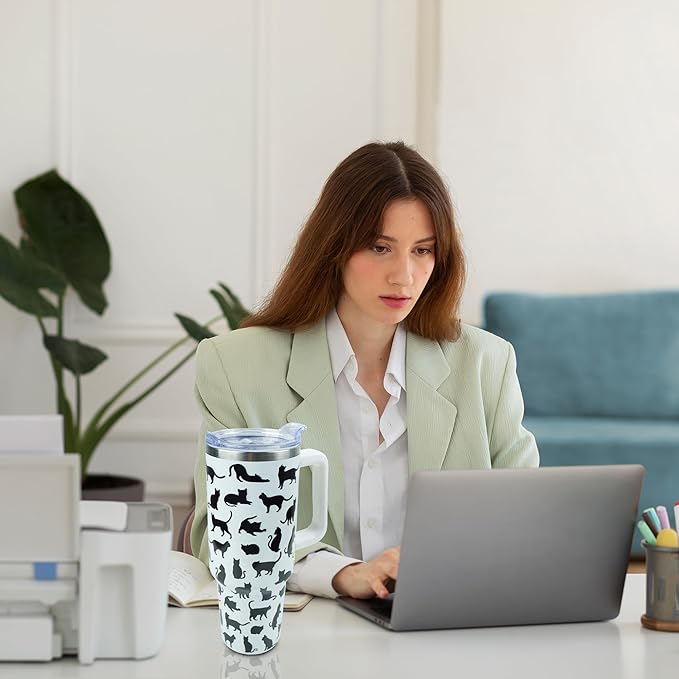 40 oz Tumbler with Handle and Straw, Stainless Steel Insulated Cup with Leak Proof Lid and Straw Lid, Keep Drinks Cold and Hot for Hours(Cat)