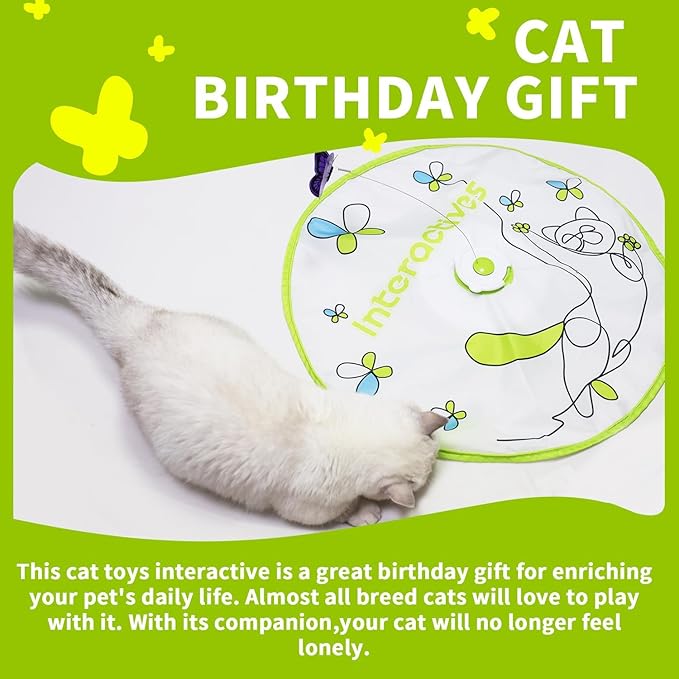 - 3-in-1 Interactive Cat Toys - This automatic cat toy features a rotating butterfly on the top, a removable cover, and an enticing tail wand hidden under the cover, consisting of an ambush hide-and-seek game. Even when left at home alone, your cat can play by itself independently like having a party.