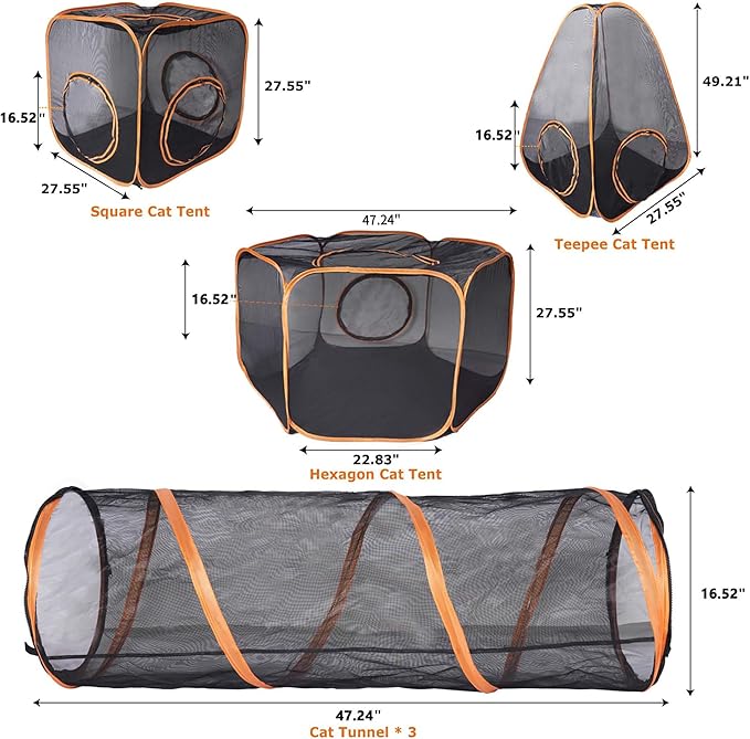 - DELUXE AND ROOMY PET TENT---Square cat tent size:27.55x27.55x27.55 inch, hexagon cat tent size: 47.24x22.83x27.55 inch, teepee cat tent size:27.55x27.55x49.21 inch, one cat tunnel size: 47.24x16.52 inch. Great for multiple cats, puppy, rabbits, ferrets, guinea pigs and other small animals. It has quite a bit of space so they can chase each other and play without feeling hemmed in.