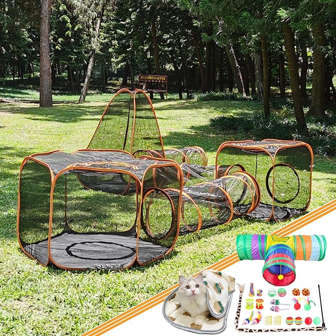Kimruule Outdoor Cat Enclosures, 6-in-1 Cat Tent Outside with Cat Tunnels for Indoor Cats, Large Cat Playpen Outdoor with Cat Toys for Cats Rabbits Ferrets Dogs and Small Animals