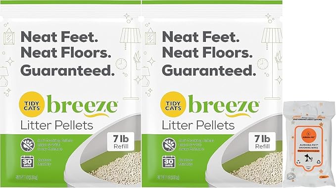 - Bundle Includes: Two (2) 7 lb Refill Bags of Tidy Cat Breeze Cat Litter Pellets and (1) Aurora Pet Wet Wipes (10 ct).