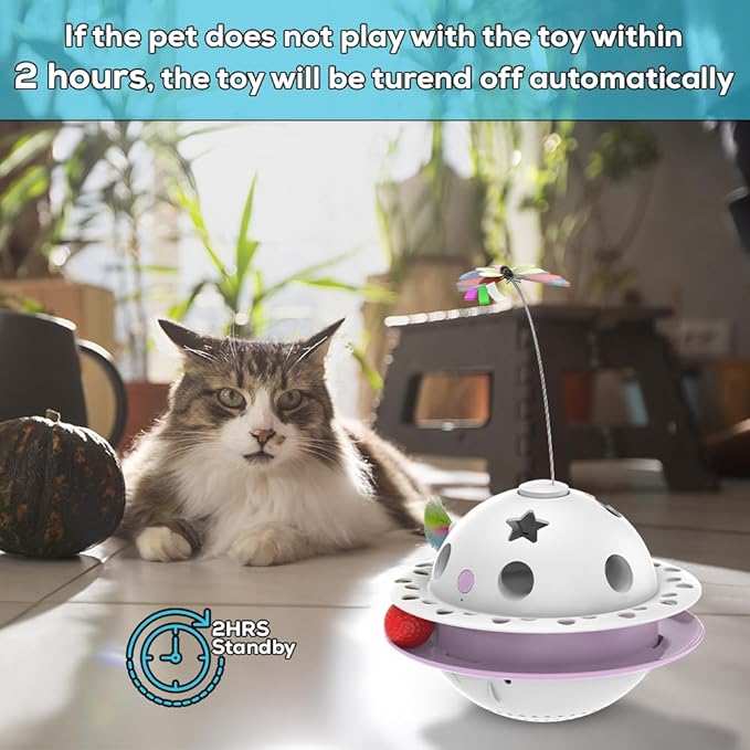 - 😺 [Smartest Cat Toy]: You don't need to manually turn the interactive cat toy on and off. 1.▶After powering up, an automatic timer runs for 5 minutes on the whack-a-mole cat toy. 2.▶If cats stop playing the game after 5 minutes, the automatic cat toy goes into standby mode for 2 hours, and it restarts once the cats interact with it once more. 3.▶The automated kitten toy will automatically be turned off after two hours if your kitties haven't touched it.