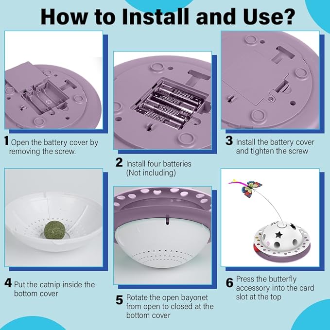 - 😺 [Dual Power Supplies]: The incredible automated cat toy can be operated by 4 AA batteries (not included) or connected by a power source. You can avoid the expense of buying new batteries by using a USB cable to connect the adapter. You can use a mobile phone adapter ≤5v (Adopter is not included)