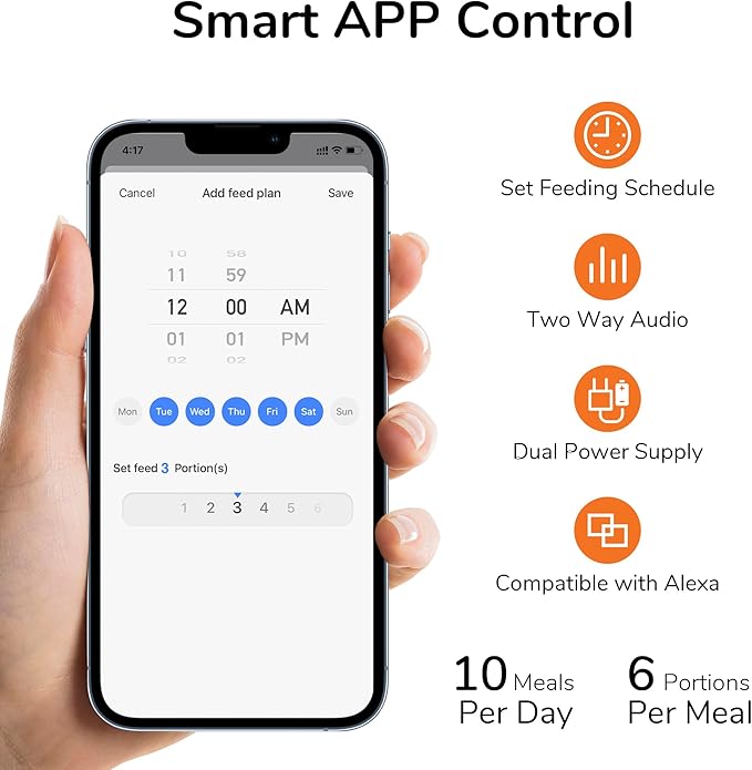 - Smart APP Control - FUKUMARU pet feeder supports 2.4GHz WiFi, allowing you to program and monitor your pet's diet anytime, anywhere through the Smartlife APP for iOS and Android phones. You can set up a feeding plan and time for your pet, with a maximum of 10 meals per day, with 1-6 portions per meal and approximately 1/12cup per portion. (Double press the button on feeder to manually feed one portion food)