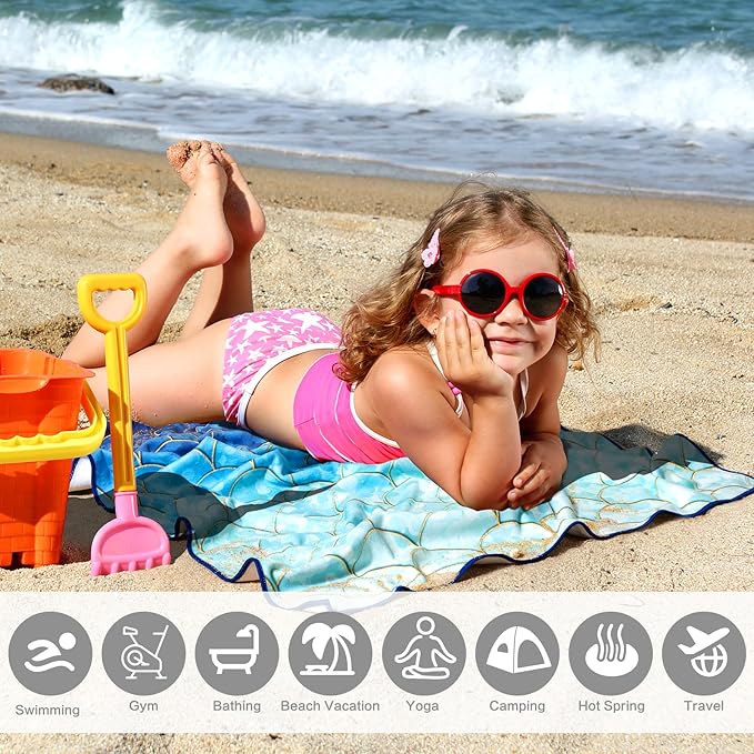 - 【Sand-Free and Large Size 】-- Mermaid Beach Towel mearsures about 60" L x 30" W . Our beach towels have plenty of room to stretch out and relax 🌴 Whether you're working on a tan or catching up on reading, you won't have to pause to shake sand away. These big towels even double as a blanket, ensuring a comfortable and enjoyable experience.