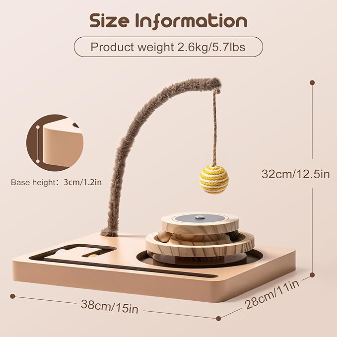 - Stable Wooden Base:The interactive cat toy's wooden base weighs 5.7 lbs and is 1.2 in high, It stays in place and won't tip over when the cat plays with it