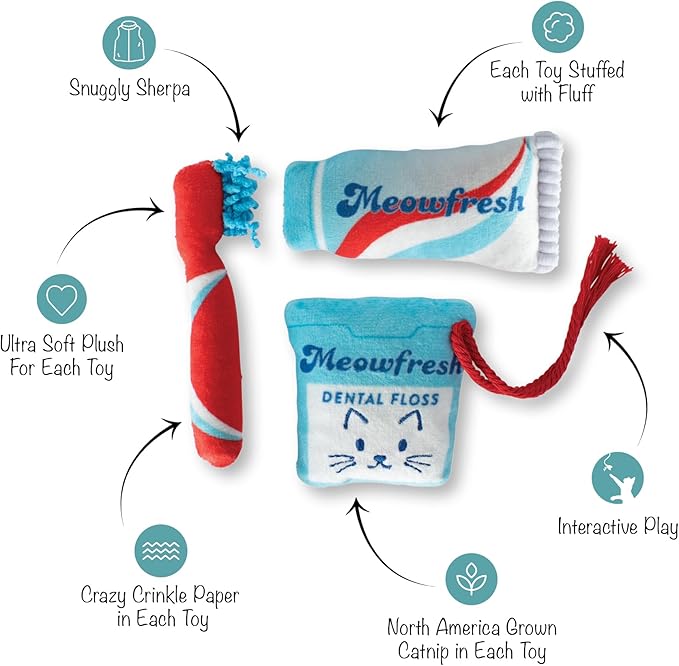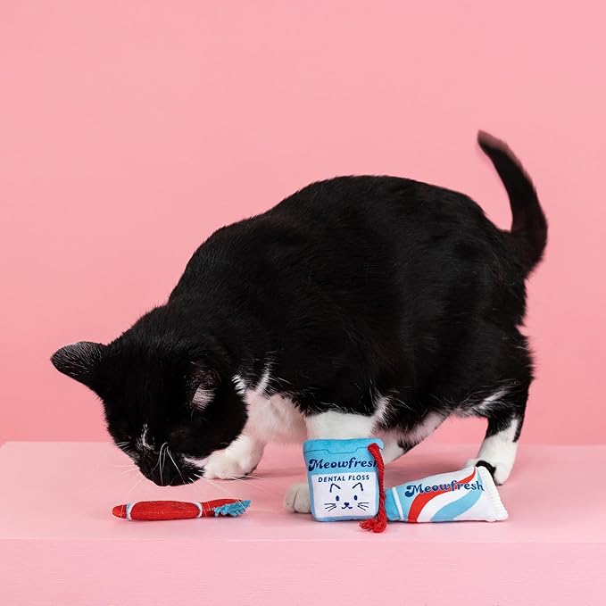 - Perfect for cats of all sizes,. Each toy is approximately 4” x 2”. ( TOOTHBRUSH: 4.5" x 1.5", FLOSS: 3" x 2.25", TOOTHPASTE: 4" x 2")