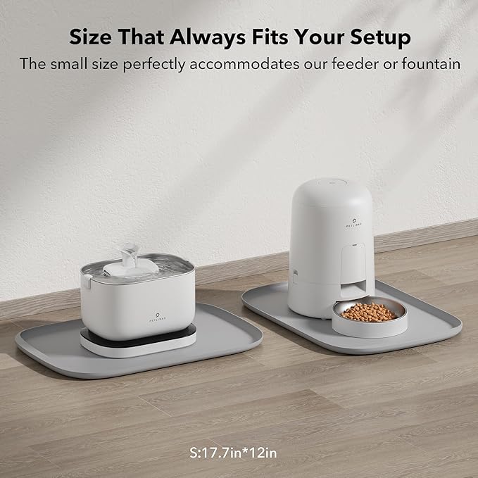 - A Perfect Fit For Every Pet And Bowl: With a range of sizes and colors to choose from, the Cove food mat is a versatile addition to any pet feeding station. The small mat measures 17.7 × 12 in, while the medium option measures 22 × 16.5 in. Not only do they fit perfectly with the PETLIBRO range of smart feeders and fountains, but they're compatible with various bowls and accessories too.