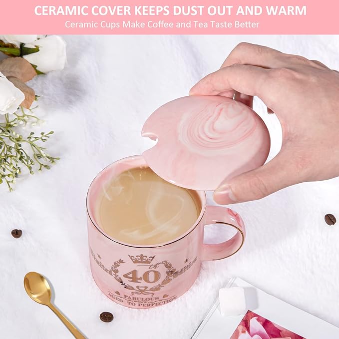 - BEST 40TH BIRTHDAY GIFTS: A good quality ceramic mug with a high gloss finish, The lid, A gold coloured stainless steel teaspoon, and A best wishes card. Which comes in a beautiful gift box with satin lining. All you had to do was write your best wishes on the card, making the gift even more special.