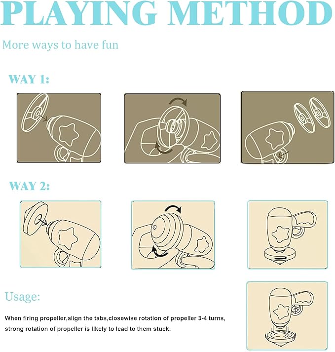 - Play Made Simple: First install the propeller, turn it clockwise 3-6 times, aim, and pull the trigger to launch, your cat will have great fun with this fetch toy. Do keep in mind not to over-twist the discs as it may hinder the toy's service life. Supervise pets during play to avoid ingestion of small parts and replace broken toys timely