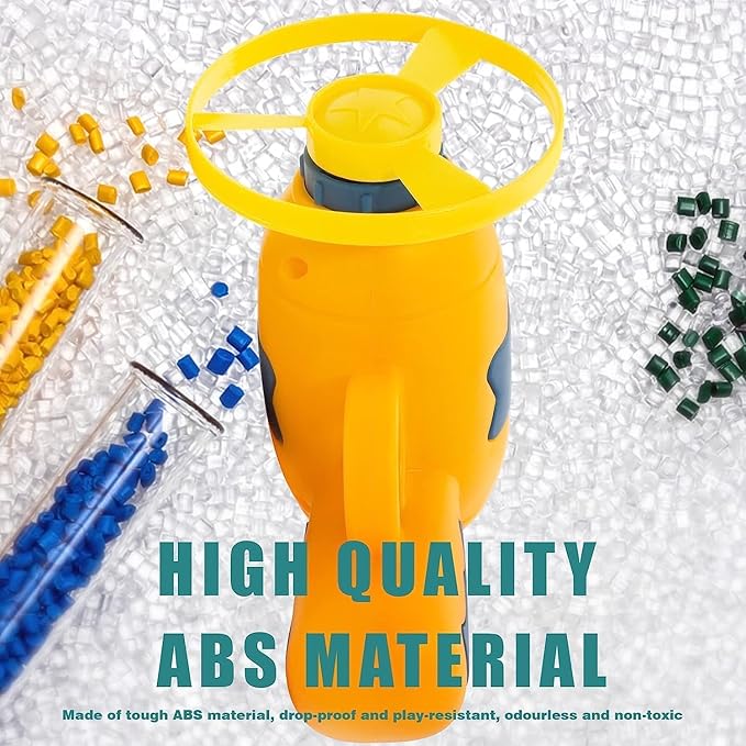 - What you will get: 1 Pcs flying disc saucer launcher (Yellow) + 1 Pcs spinning tops 5 Pcs flying propellers, Random colors of spinning tops and flying propellers. Disc launcher size: 4 x 4.3 x 2 inch; Spinning Tops size: 2.5 x 2.5 x 1 inch; Flying propellers size: 3 x 3 x 0.9 inch