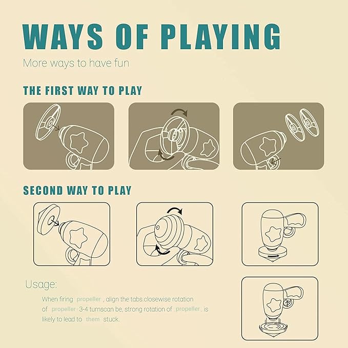 - Play Made Simple: First install the propeller, turn it clockwise 3-6 times, aim, and pull the trigger to launch, your cat will have great fun with this fetch toy. Do keep in mind not to over-twist the discs as it may hinder the toy's service life. Supervise pets during play to avoid ingestion of small parts and replace broken toys timely