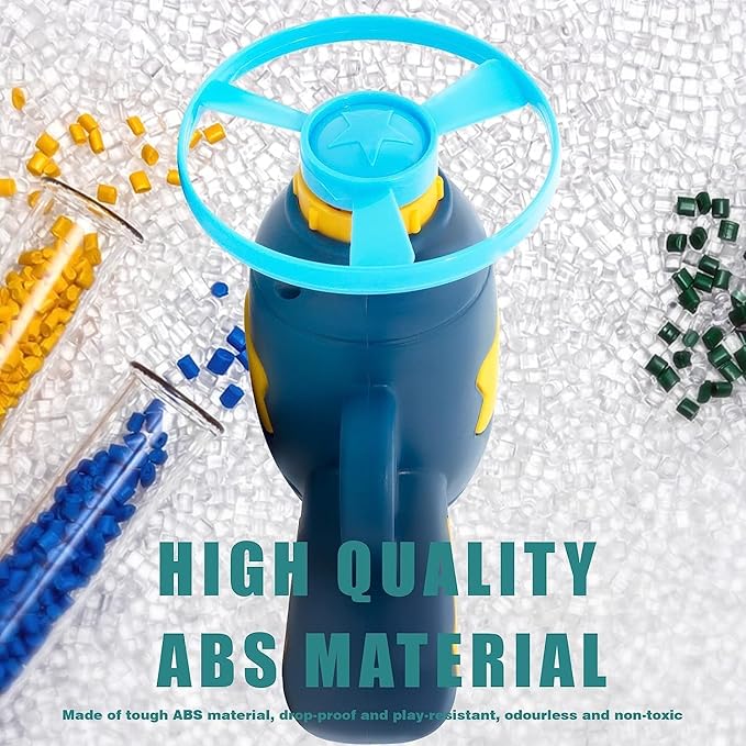 - What you will get: 1 Pcs flying disc saucer launcher (Dark Blue) + 1 Pcs spinning tops + 5 Pcs flying propellers, Random colors of spinning tops and flying propellers. Disc launcher size: 4 x 4.3 x 2 inch; Spinning Tops size: 2.5 x 2.5 x 1 inch; Flying propellers size: 3 x 3 x 0.9 inch