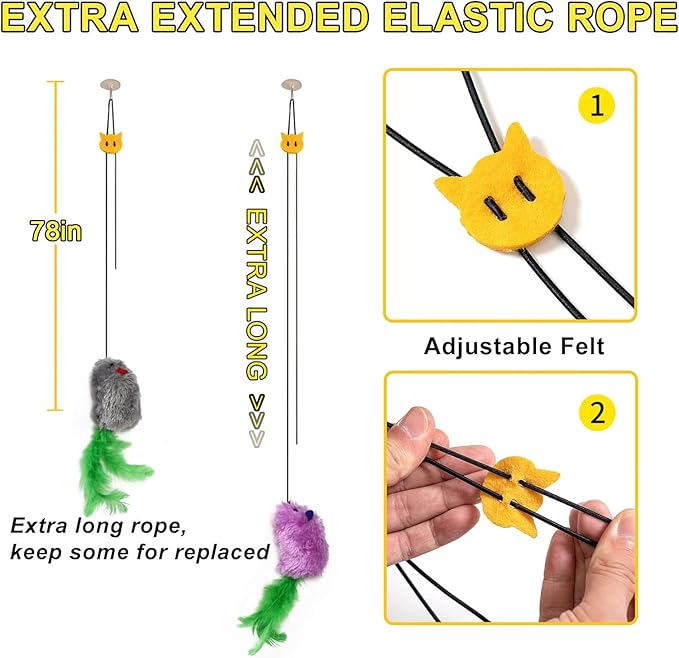 - Adjustable and durable: The elastic rope of this hanging cat toy extends from 10" to 78" (2.0m) and is made of thick, abrasion-resistant material. Even if your cat bites off the rope, you can still tie it back on for longer life.