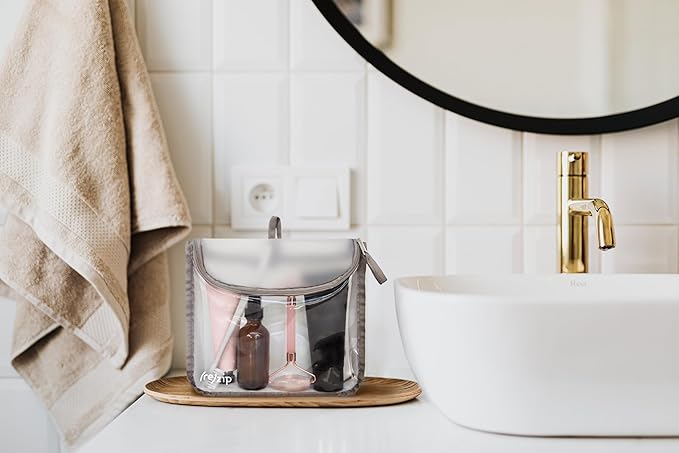- HANGING LOOP: Hang the bag from a hook in your hotel bathroom or from the door of your gym locker. The clear front panel lets you see what's inside without having to open the bag, so you can quickly find what you're looking for.