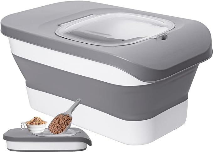 - Control of Food Intake and Space-Saving: The dog food travel container comes with a dog food scoop,you can more easily control the amount of food taken out and the food intake of your pets.The dog food bin is also foldable, making it easy to store and saving precious space in your home