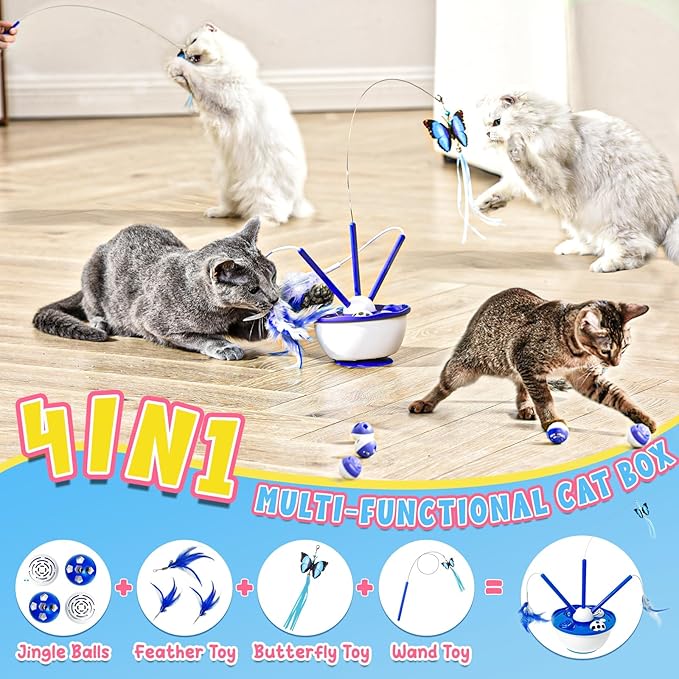 Cat Toys 4 in 1 Automatic Interactive Kitten Toy, Fluttering Butterfly, Moving Feathers, Bell Balls, USB Powered, Cat Exercise Toy Self Play for Bored Indoor Adult Cats