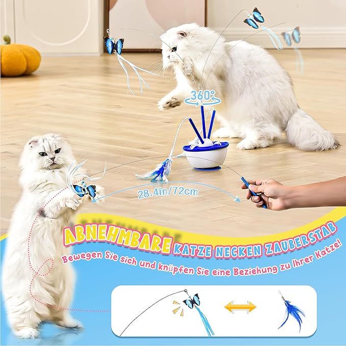 - [Safety Material] The outer shell of the automatic cat toy is made from ABS material, ensuring a smooth surface with no protrusions. The butterfly edges are rounded, feathers are soft without any sharpness, all aimed at keeping cats safe during play. Moreover, the wand can be easily adjusted by hand, providing the desired height for your cat's enjoyment.