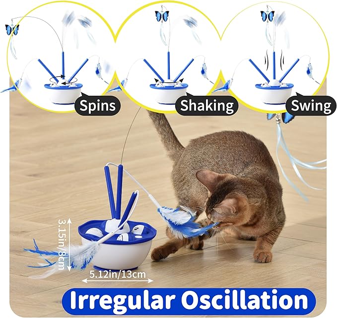 - [Purr-fect Playtime] Petcronies interactive cat toys brings a burst of excitement to playtime! It includes a fluttering butterfly that cats can't resist pouncing on, feathers that spin for endless chasing fun, and 4 bell balls for kicking. All accessories are detachable, adding extra fun and ensuring indoor cats never have a dull moment.
