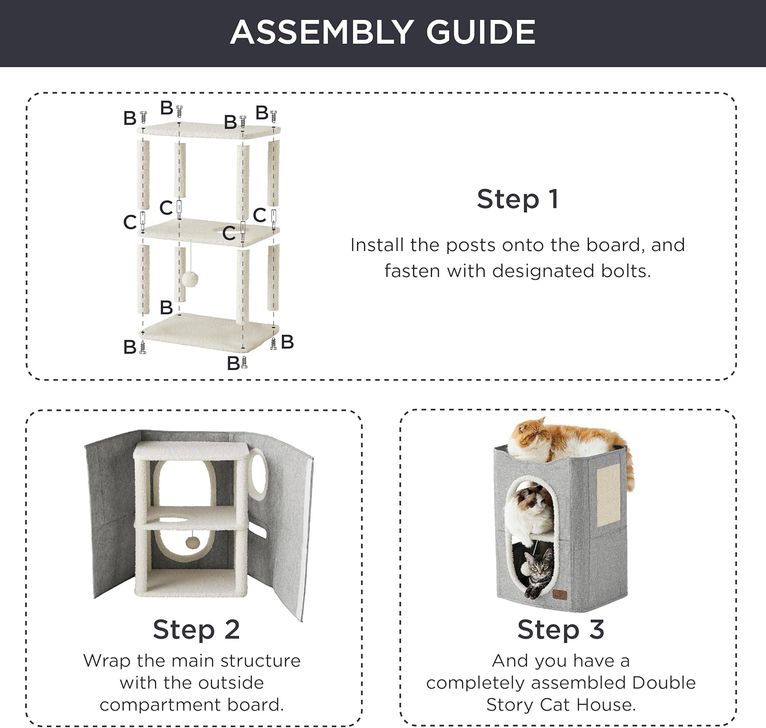 - Simple Assembly & Maintenance: With our easy-to-follow instructions, this indoor cat condo can be set up in minutes or folded flat when it's time for some deep cleaning or travel. Spot-cleaning is all it needs to stay fresh.