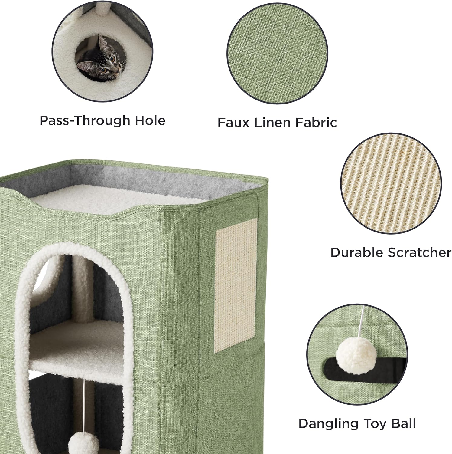 - Pet-Safe Design: This 2-level cat house is crafted with CARB Certified high-strength medium density fiberboard and plush, gentle lambswool fabric for added comfort. Plus, it's got a sturdy sisal scratching board for hours of kitty entertainment.