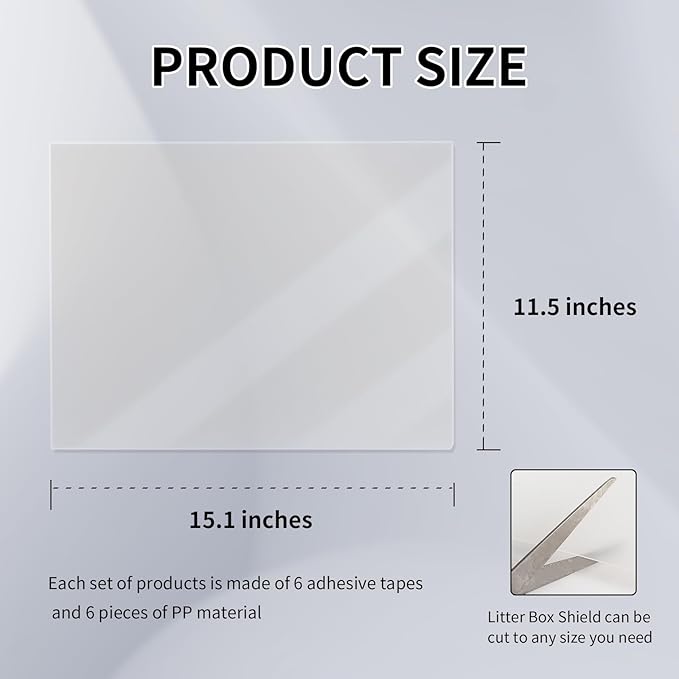 - Sizes:6 Litter Box Splash Guards per package and 6 Double-sided tape, each 15.1 in. x 11.6 in,Cut and adjusted to fit your different sized litter boxes