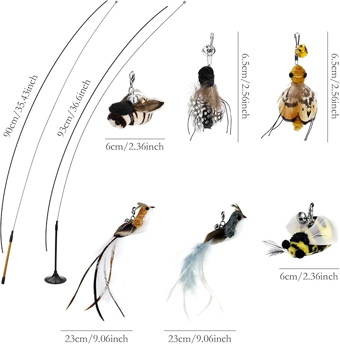 - What you will get: The cat feather toy set includes 6 different animal feather refills, 1 handheld steel wire and 1 suction cup cat wands. You can experience the fun of teasing cat by combinationing.